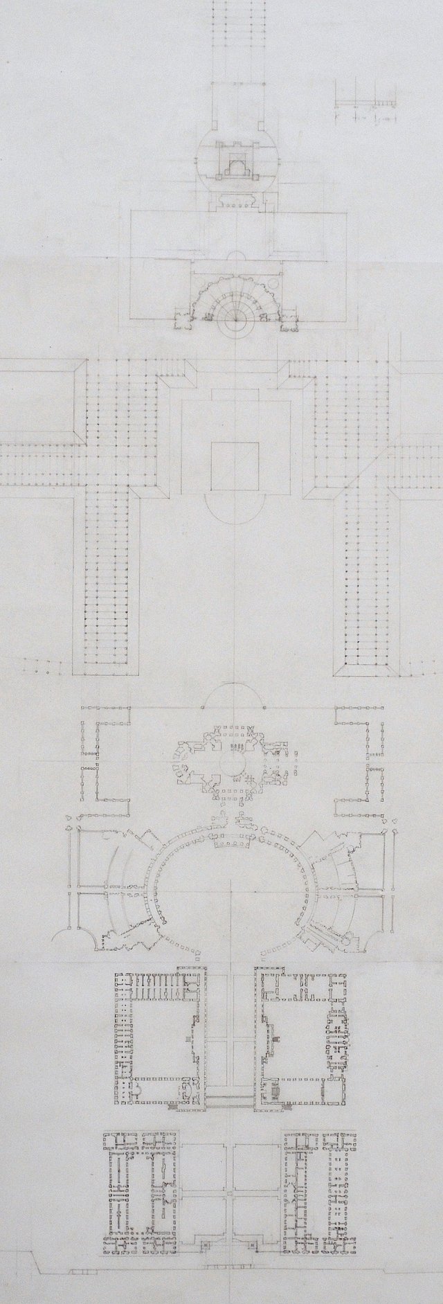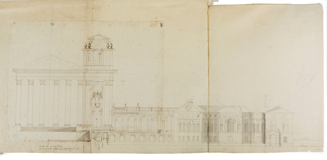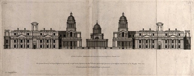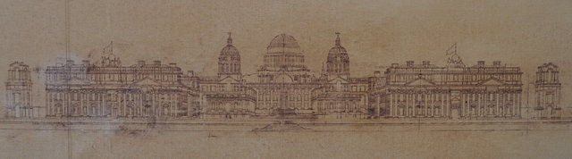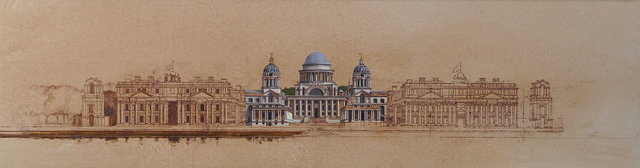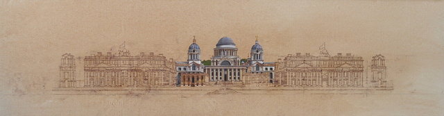 - Part elevation in Sir John Soane’s Museum of Hawksmoor’s “Second Scheme” to build a large domed Chapel on the site of the Queen’s House, with a large elliptical Bernini style piazza in front of it, linking it to the existing hospital buildings.
