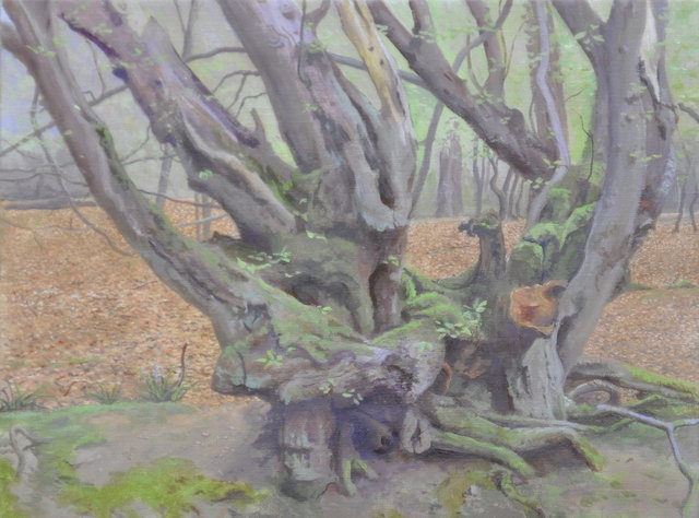 I decided not to take Hawksmoor’s Third Scheme to the stage of a perspective painting. I simply could not find the energy to paint the Christopher Wren buildings yet again. By taking the original King Charles block by John Webb and reproducing it symmetrically on the opposite side of a new courtyard, and then reproducing that block twice more to to create a wider frontage on the river for each side of the courtyard, Wren has made it necessary to reproduce the same initial building four times in each scheme. To paint all four again was simply too much! I decided to spend my “lockdown” instead doing some small landscapes and still lifes. The landscapes are of the stumps and hedgerows we saw on our permitted exercise periods each day. We are so fortunate to have access to the countryside for this and can actually walk in a wood without seeing more than one or two other people and that at the height of the bluebells!