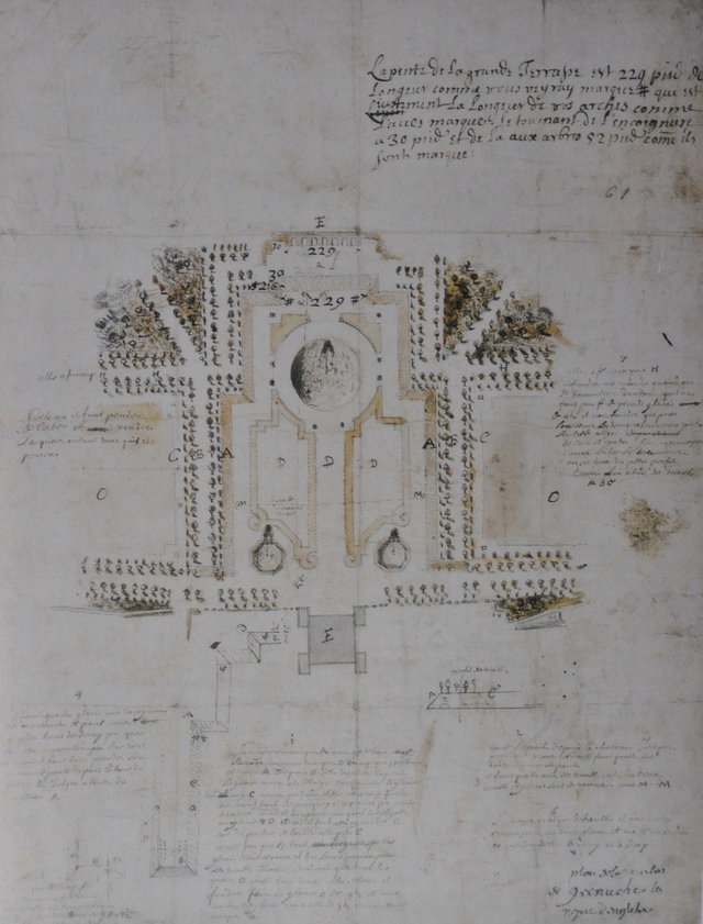 Le Nôtre’s plan gives dimensions which tally with the dimensions of the still visible earthworks in Greenwich Park. If the parterre width of 229 feet indicated on the plan are taken as a given, the scale of the parterre is quite immense and the arches which are annotated as the same size become quite high when given a reasonable proportion similar to the ones le Nôtre built at Vaux le Vicomte.