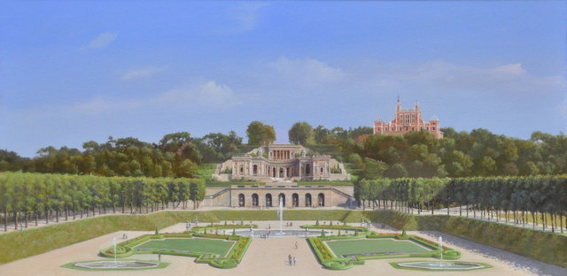 I also chose to paint a variation of the parterre without Webb’s “Grot & Ascent”, but instead climbing from the level of the parterre to the top of the hill via a series of twelve “Giant Steps”, with a central more gently sloped ramp, which were actually cut into the hillside in 1661-2 and are still visible in the landscape and seen in a number of contemporary engravings in John Bold’s book.