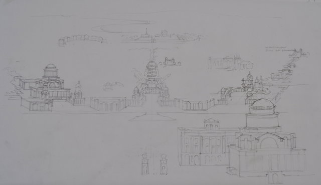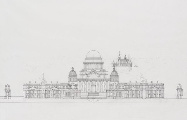 I think my project should be to depict Hawksmoor’s various schemes as if they had been built; to stitch the various fragments together into a whole. There were three major schemes by Hawksmoor, with many variations within each one. At one point he proposed incorporating Le Notre’s gardens into his arrangement and actually moved the Queen’s House and the Royal Observatory to be axially part of his composition.