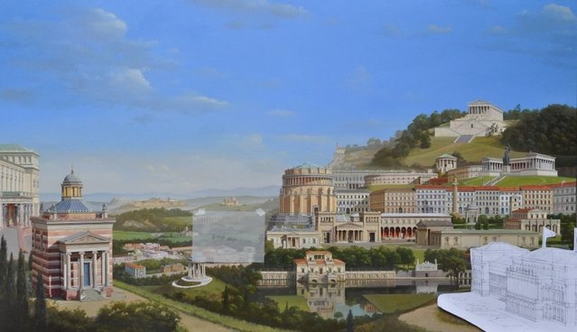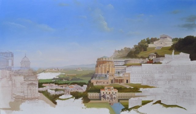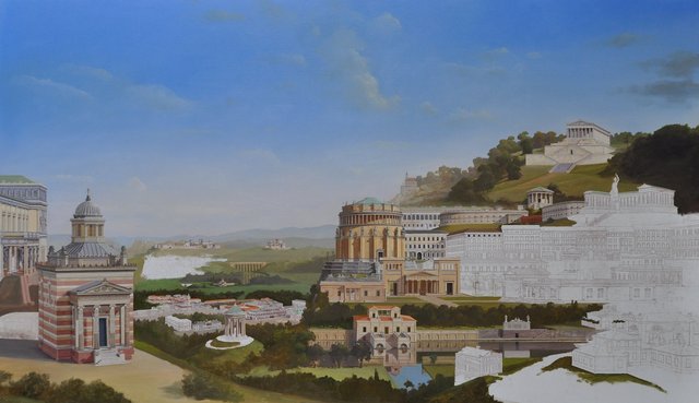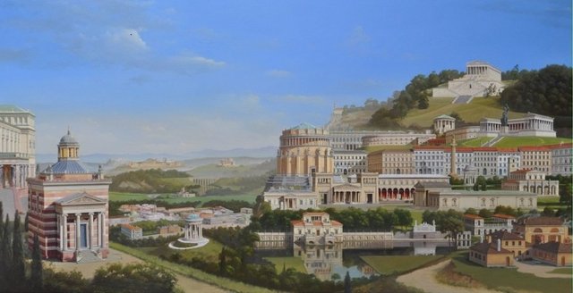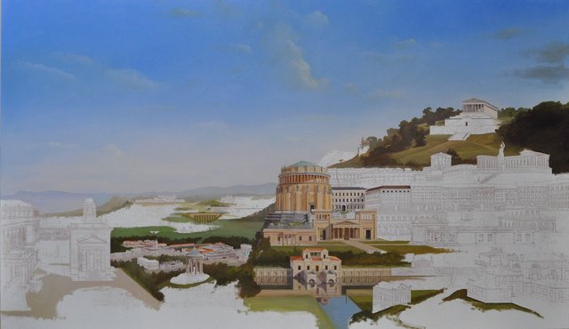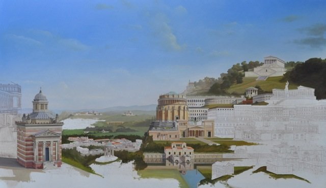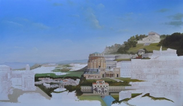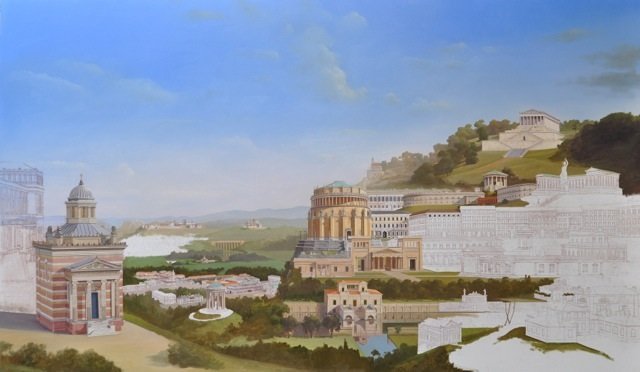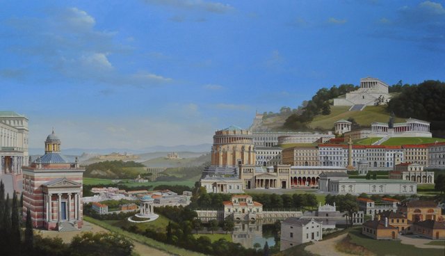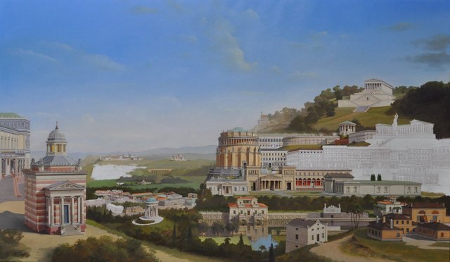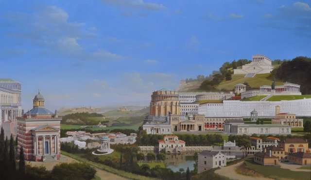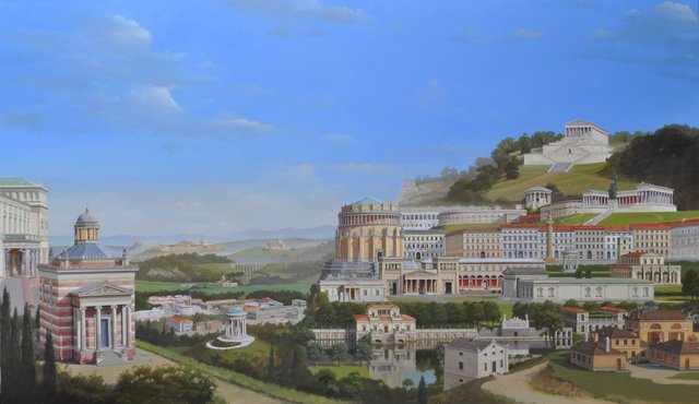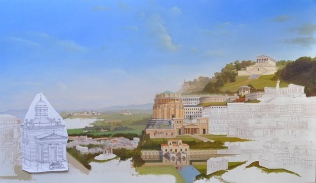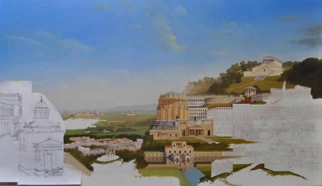 The new project is to depict the architecture of the German neoclassicist, Leo von Klenze (1784-1864), the Bavarian counterpart of the better known Prussian architect, Schinkel. I was planning to attempt a Schinkel capriccio when I was persuaded by David Watkin that von Klenze would be much more interesting and worthwhile as he is so little known in England. I first encountered von Klenze in about 1987 when Léon Krier gave me a book on his paintings and drawings. I still knew very little about his architecture when I decided on this project, but the general lack of knowledge about his work seemed like a good reason to undertake it. Later, looking for a date to give significance to producing a painting at this particular moment, like the cinquecentenario was relevant for the Palladio paintings, I found that 1816 (assuming I finished the painting by 2016) was the date when the foundation stone was laid for Klenze’s Glyptothek, his first major building and the start of his work for Ludwig I in Munich where many of his buildings are located.