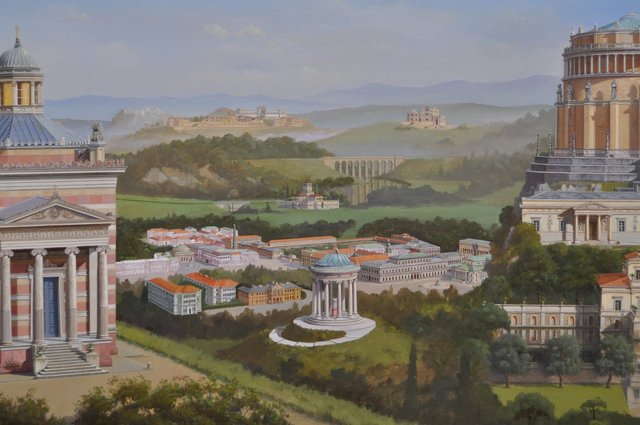 Klenzeana may be finished on the Vernal Equinox! I am not certain but will live with it for awhile and see if anything jumps out at me as needing more work. I have been going over the painting; intensifying it, adding landscape and populating it (staffage!) relandscaping the Ruhmeshalle, adding a procession to the Stourdza Chapel.