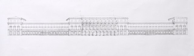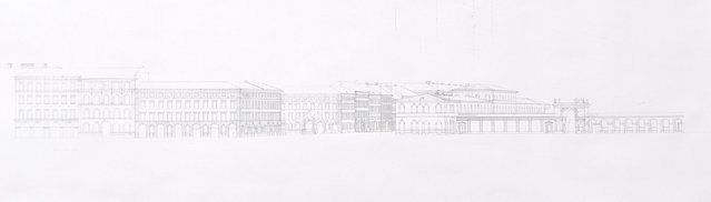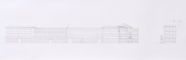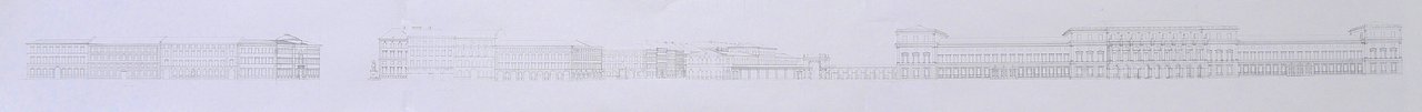Having established the scale to von Klenze’s drawings, I copied at the same scale of 1:200 all the buildings by him on Ludwigstrasse, the street in Munich he designed to expand the city northward from the old palace, the Residenz. This comprises essentially everything from the Residenz to Theresienstrasse, about four city blocks, on both sides of Ludwigstrasse, resulting in a drawing at 1:200 for each side of Ludwigstrasse 4’’ high and 12’ long. This was clearly going to be a problem if the buildings were to be depicted at a size large enough to be identifiable and interesting. Perhaps the answer would be to concentrate on the area around Odeonsplatz at the southern end of Ludwigstrasse, for the foreground, and show Ludwigstrasse receding in perspective, foreshortening that 12’ length. This also would have the benefit of concentrating on the rather complex and interesting urban design of the Odeonsplatz area. Apart from the interest of von Klenze’s individual buildings, I found in Munich that I was fascinated by the sophistication of his urban design – the way he wove together the various elements, especially in that area around the Odeonsplatz, centering the Odeonsplatz on the Bazar opposite and placing the Hofgartentor archway centrally in the gap between the Bazar and the end of the Residenz and on axis with the new Briennerstrasse he created opposite. You can actually start in Max-Joseph-Platz, south of the Residenz, with Klenze buildings on three sides (the Konigsbau, the Staatsoper, and the Hauptpost); walk down the side of the Staatsoper and behind it to the Marstallplatz looked over by his Allerheilgenhofkirche, Marstall, and his east facade of the Residenz; move on to the Festsaalbau facing onto the Hofgarten with von Klenze’s buildings on three sides and then on through his Hofgartentor archway onto Odeonsplatz and Ludwigstrasse. A continuous sequence of Klenze buildings, or facades in some cases, all joined by carefully defined spaces to lead you on a “promenade architecturale” that I think is without equal in having been built by one architect.