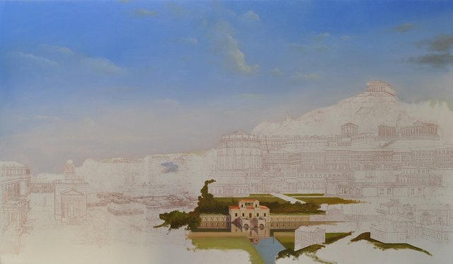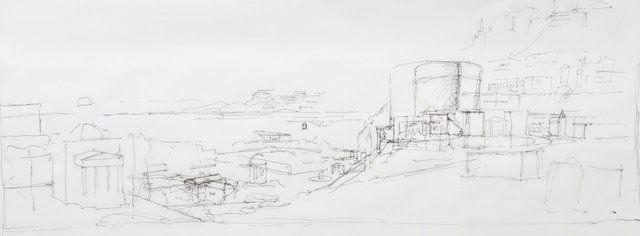 As the New Hermitage has appeared on the far right foreground, it can disappear from the middle ground where it was not very well integrated. The new position is much better as the atlantes, the male sculptural columns in the entry loggia, will be more visible. In the landscape beyond I want to incorporate the painting Klenze made of the Atlant in Agrigento, as a reference to both his painting and his archaeological work. I have put two of his early hypothetical villa designs in the foreground so that the foreground contains his earliest work and his last, the Stourdza Chapel.