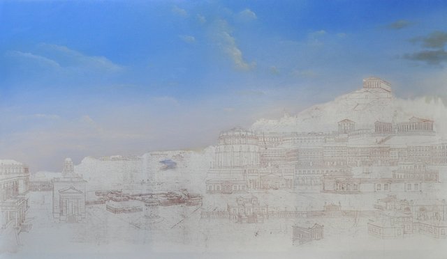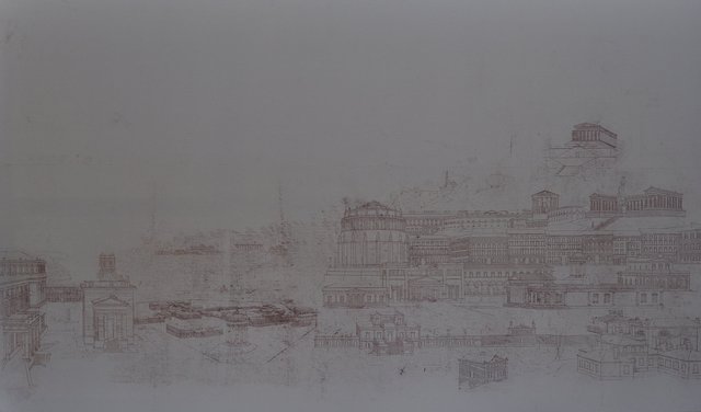 Conversely, it would be possible to include in the distant landscape, created by looking down on Ludwigstrasse, some of the larger projects which would be best seen from a distance such as Klenze’s design for a royal palace in Athens. If shown at the same proximity as Ludwigstrasse it would dominate the composition and is not designed to the same level of detail so is perhaps better seen from a distance. It can sit in the landscape much as it was intended to sit in relation to the acropolis. In fact, it might be appropriate to include the Acropolis as a reference to Klenze’s interest in archaeology and as specific inspiration for Walhalle.