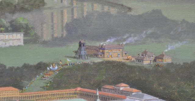 Having worked on the small scale aerial view over Munich in the middle ground, and reassured myself that it will work as an idea, having those buildings so small, I decided to make a start on the neglected right hand foreground corner of the canvas. The first thought was to enlarge the Attendant’s House from Walhalla. It seemed out of scale with the nearby buildings and is much better slightly (30%) larger.