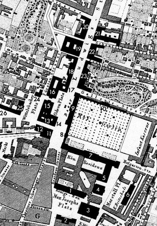 Klenze’s drawings of the Arco Palais on Wittelsbacher Platz and and an early photograph show a no longer existing dome over the entry hall and a much more shallowly pitched roof. Otherwise his drawings tally with the existing building.