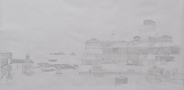 Over the summer, I have been struggling with how to compose the new painting and how to incorporate some sense of the elegant urban design von Klenze introduced in the development of Munich. The very long lines of buildings along Ludwigstrasse and Briennerstrasse which I drew up were interesting and certainly helpful in acquainting myself with von Klenze’s work, but I cannot see how to use them in that form in the painting. I thought it might be a more promising approach if the painting contained a view down from above over the city centre so one had a sense of the plan of the area around the Residenz, Odeonsplatz and Ludwigstrasse.