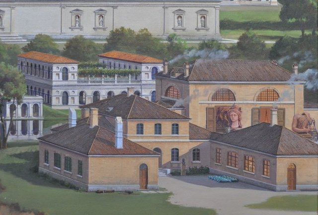 In my old formula for a classical landscape handed down to me by John Outram this is, in fact, correct. It is part of the formula to proceed from the more humble, rural areas into the painting, getting ever more refined architecturally until arriving at the temples at the apex of the journey. Other rationals for retaining the Erzgiesserei in the foreground are the surreal interest of the enormous head of the Bavaria statue shown in the courtyard and the fact that it is a speculative reconstruction of a building long since demolished which I think makes it quite interesting. But I keep coming back to thinking it would be more appropriate to have the Festsaalbau in this important spot.