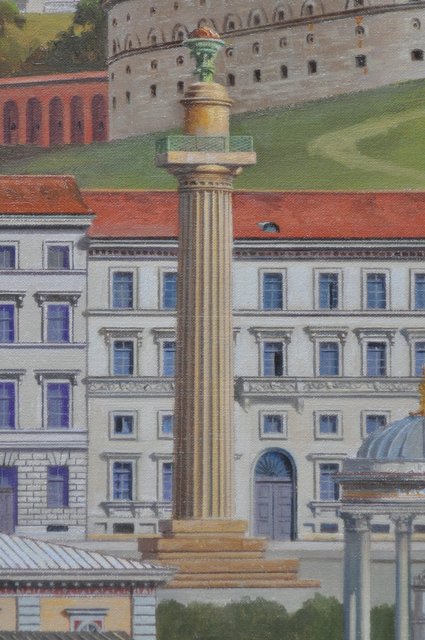 I have continued adding buildings, most importantly the Hermitage in St Petersburg on the extreme left which needed a little adjustment to its perspective from the drawing I had put on the canvas. Also, I have added the section of Ludwigstrasse that appears to the right of the circular Befreiungshalle in the centre of the painting. That fills in the last major portion of white canvas remaining. I decided to break up this run of buildings on Ludwigstrasse with the Konstitutionssaule, a monument commemorating the Bavarian Constitution in the form of a Doric column. I initially thought this a straight forward Doric design until I looked more closely at the capital.