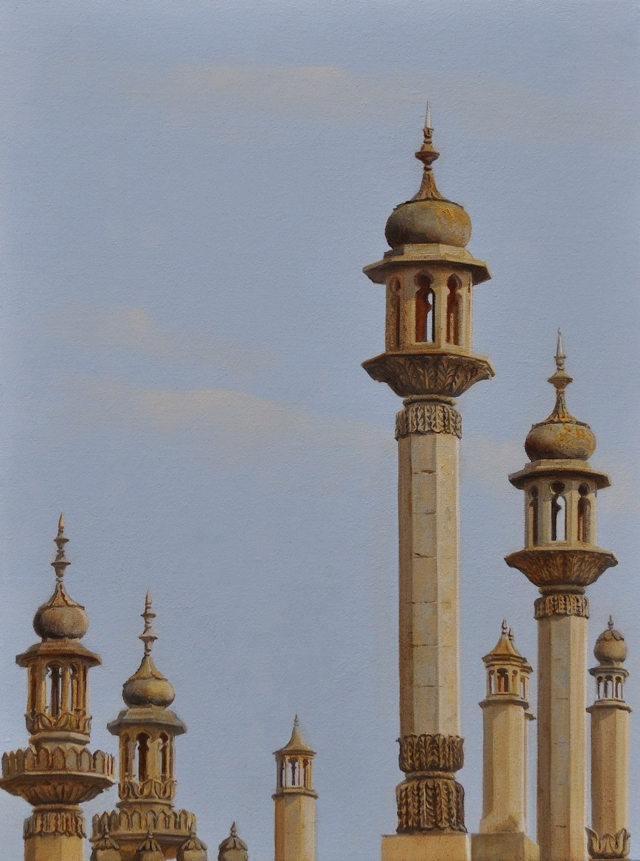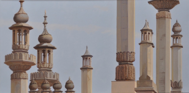 Making progress but the Royal Pavilion is slow work. It is such complex geometry and the collision of elements is difficult to get right. In stepping up the scale from drawing to painting I discovered I had made the central dome too large and had to repaint it. It is such a perfect building to have in the foreground because of its complexity.