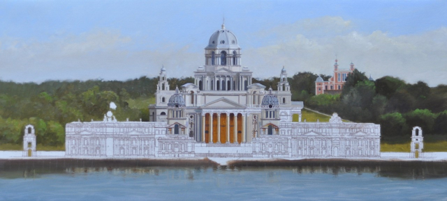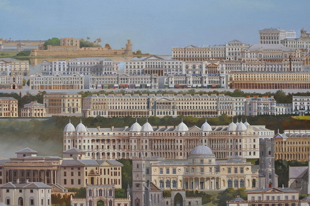 Now I am back at the Nash project and am reacquainting myself with painting. To get back into painting shape after such a long layoff and before tackling Nashville, I have done a number of smaller paintings. These consist of a series of roofscapes based on the Brighton Pavilion and a start on a new project I have in mind based on Hawksmoor’s unbuilt schemes to complete the Royal Naval Hospital at Greenwich. These paintings gave me confidence to start work again on Nashville which is now progressing up the right hand side of the painting. I think I must put the other work aside now and concentrate on Nashville as it is quite easy to lose my way if it does not have my full attention. I am excited by the Hawksmoor project but find that, with Nash, is too much. I spoke at length about the Hawksmoor idea in my Henry Hope Reed acceptance talk in Chicago in March, showing my preliminary drawings for it for the first time and found it was well received as an idea. Hopefully the idea will stay fresh while I carry on with Nashville.
